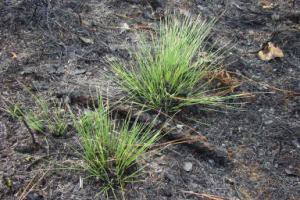 One or more ripe fruits are visible on the plant. For Aristida stricta, a fruit is considered ripe when it is hard when squeezed and difficult to divide with a fingernail, or when it readily drops from the plant when touched. Do not include seed heads that have already dropped all of their grains.