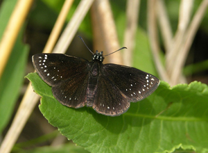 The upperside of the Common Sootywing is glossy black with small white spots on the outer third of the forewing. The females have more white spots on the forewings than the males, and a row of spots on the hindwing occurs just in from the margin. The underside of forewing repeats the upperside, while the hindwing is solid black.