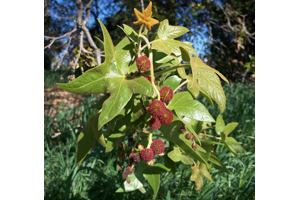 Fruits One or more fruits are visible on the plant. For Platanus racemosa, the fruit is very tiny and capsule-like, crowded into globular clusters of many fruits, and changes from green to tan or light brown. More...