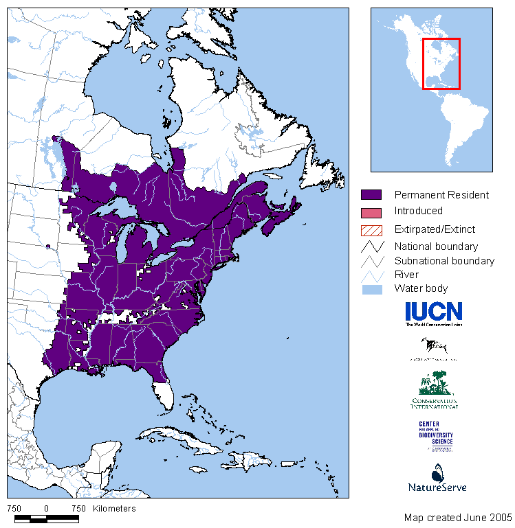 Range extends throughout the eastern United States and adjacent southeastern Canada east to Labrador, west to Manitoba, Minnesota, Iowa, eastern Kansas, Oklahoma, and eastern Texas, south to the Gulf Coast and northern Florida.